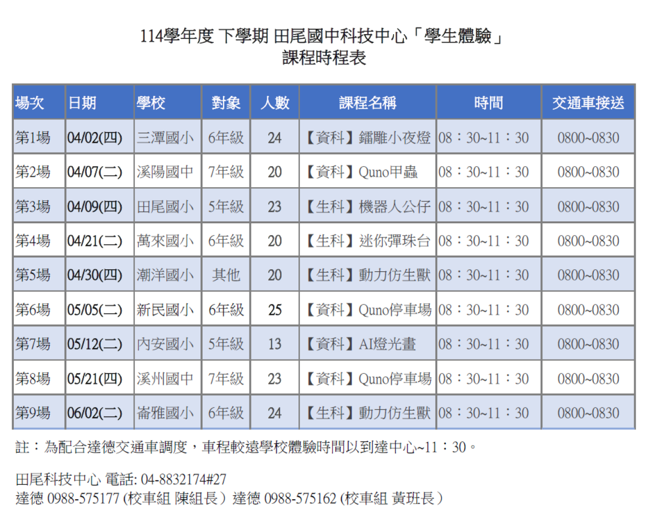 114學年下學期田尾科技中心學生體驗錄取學校及課程體驗內容時程表